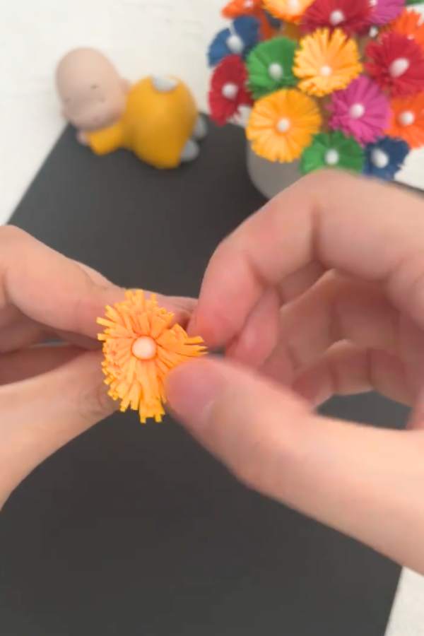 Once fully rolled, gently spread and flatten the cut edges to form the flower petals.