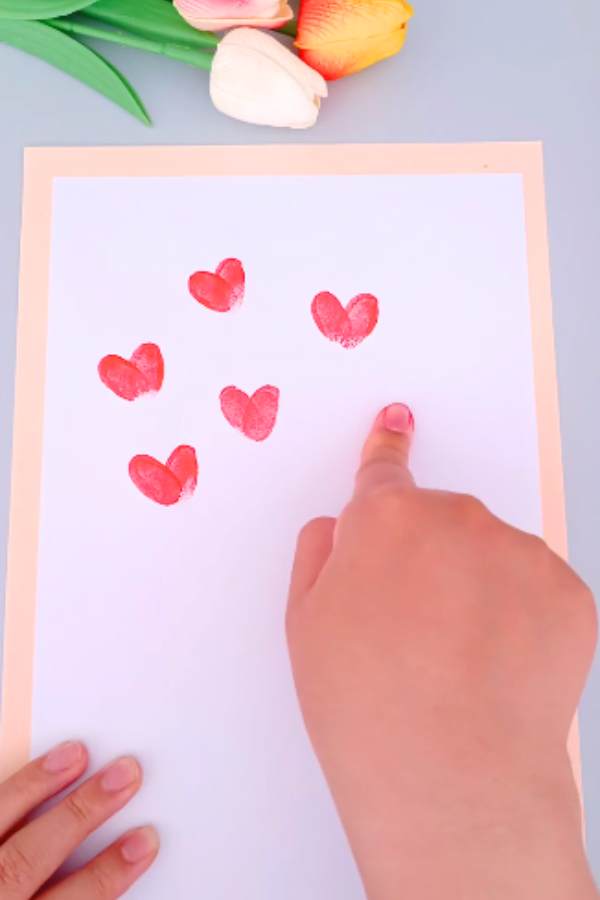 • Press your finger onto the white cardstock to create heart-shaped petals. You can make the shape by pressing twice at an angle to form a heart.