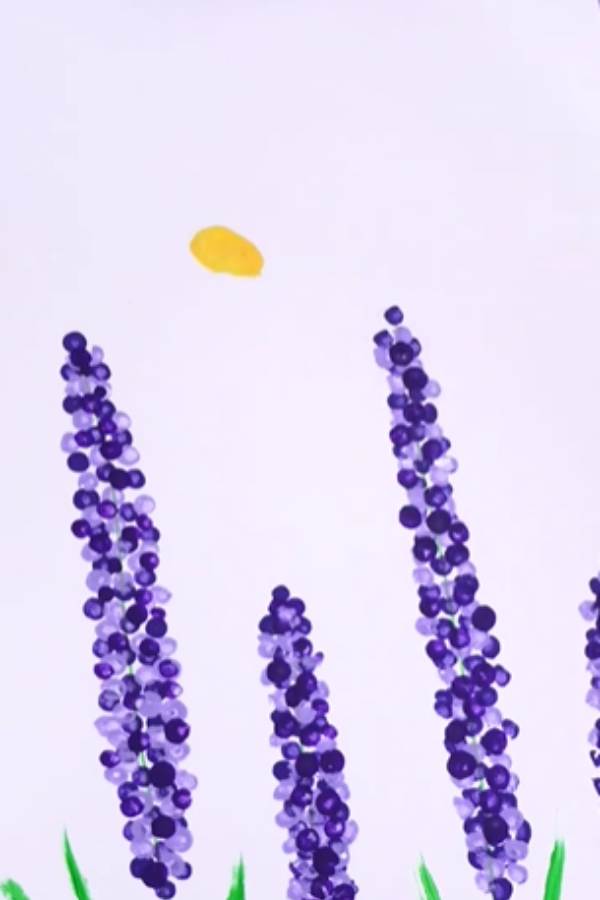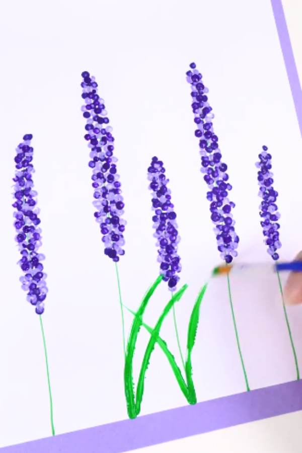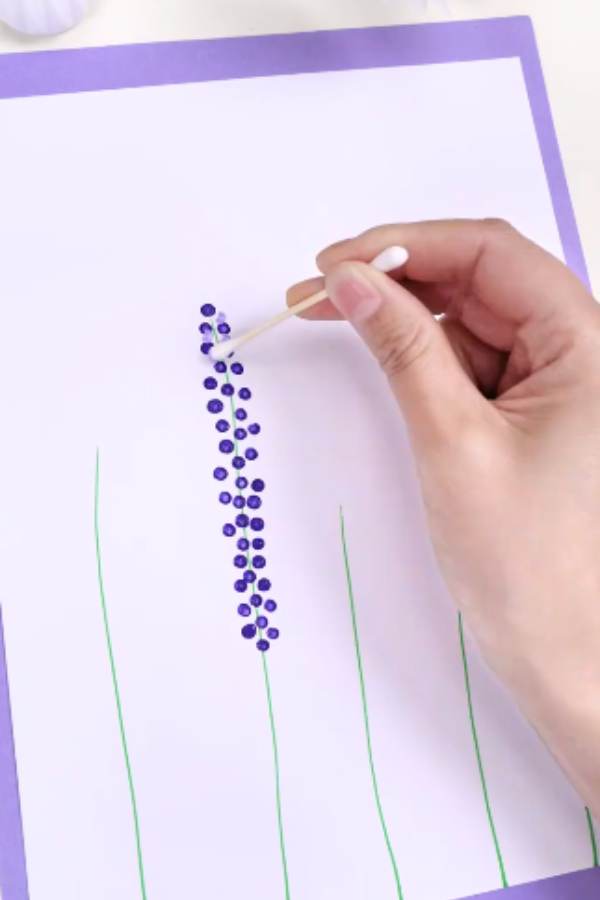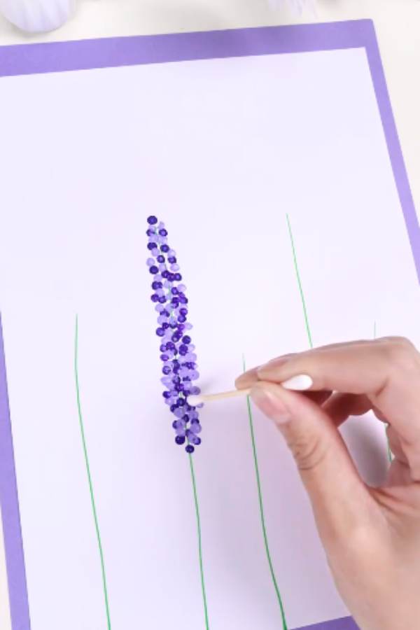 • Now, dip a Q-tip in lighter purple paint and fill in any empty gaps on the stems with little dots of the lighter color. This will make your flowers pop with different shades!